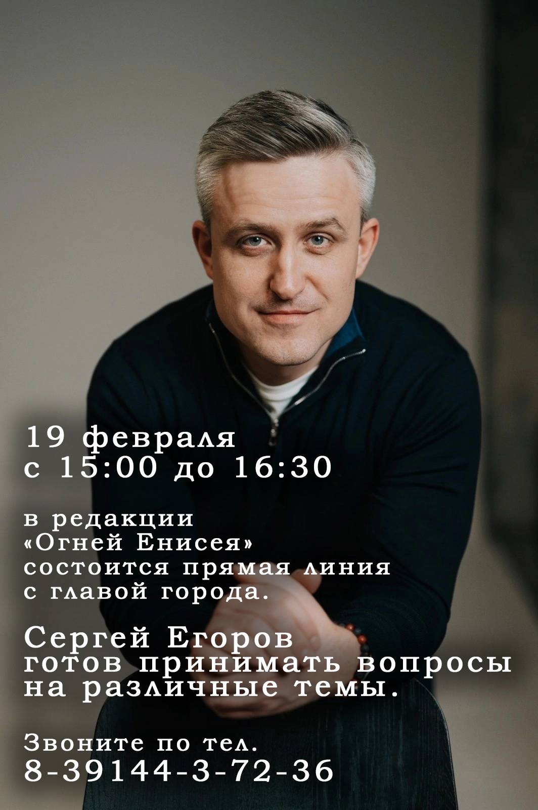 Глава Дивногорска Сергей Егоров / фото https://vk.com/egorov_s В понедельник, 19 февраля с 15:00 до 16:30 в редакции «Огней Енисея» состоится прямая линия с главой города.