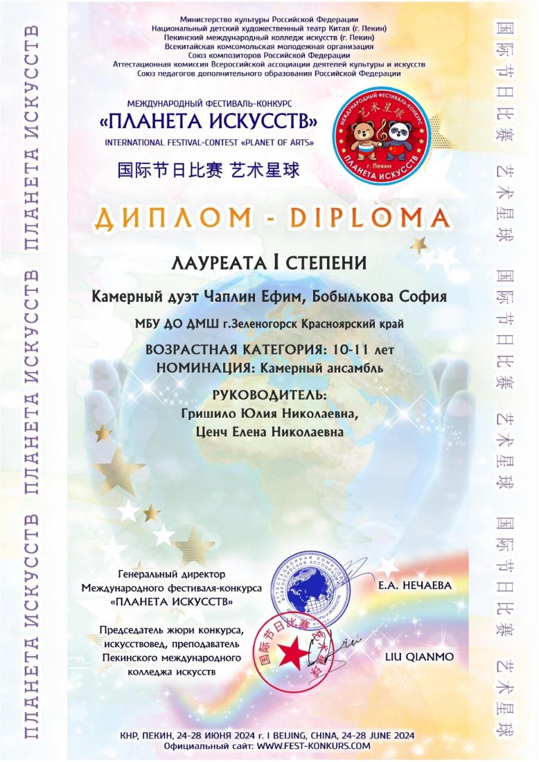 Поздравляем камерный дуэт в составе Ефима Чаплина (скрипка) и Софии Бобыльковой (фортепиано) с лауреатством 1 степени в возрастной категории 10 - 11 лет Международного фестиваль-конкурса "Планета искусств".