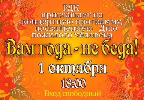1 октября в 18.00 в районном Доме культуры состоится концертная программа, посвященная Дню пожилого человека. Это мероприятие имеет важное значение для нашей общества, так как оно направлено на признание и уважение пожилых людей, которые внесли значительный вклад в наше общество.