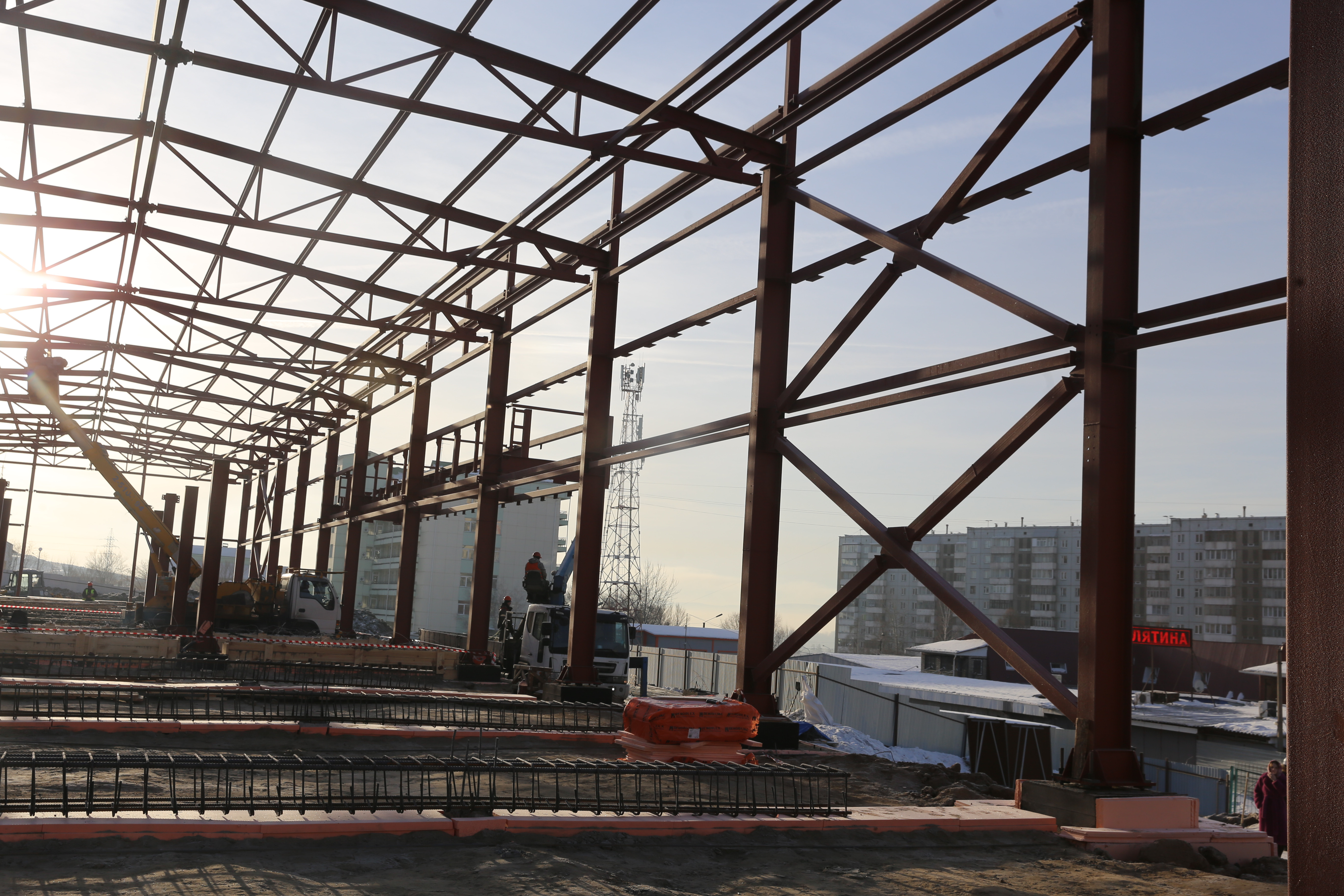 Сегодня на строительной площадке в Солнечном активно ведутся работы. Специалисты забили уже больше 100 свай, смонтировали колонны, ведут монтаж металлоконструкций и готовят основание для плит пола будущего объекта.